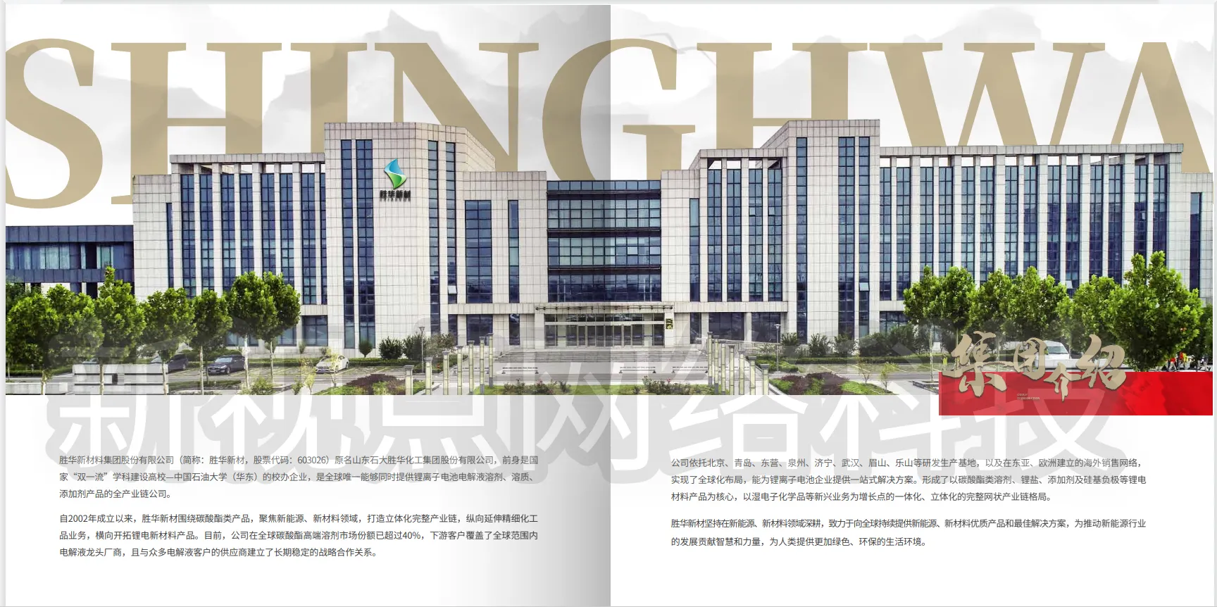 胜华新材料集团股份有限公司(简称:胜华新材,股票代码:603026)原名山东石大胜华化工集团股份有限公司,前身是国家“双一流”学科建设高校一中国石油大学(华东)的校办企业,是全球唯一能够同时提供锂离子电池电解液溶剂、溶质、添加剂产品的全产业链公司。