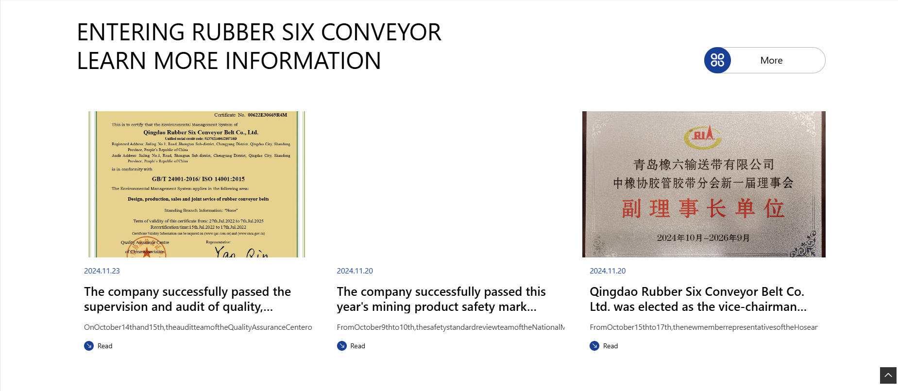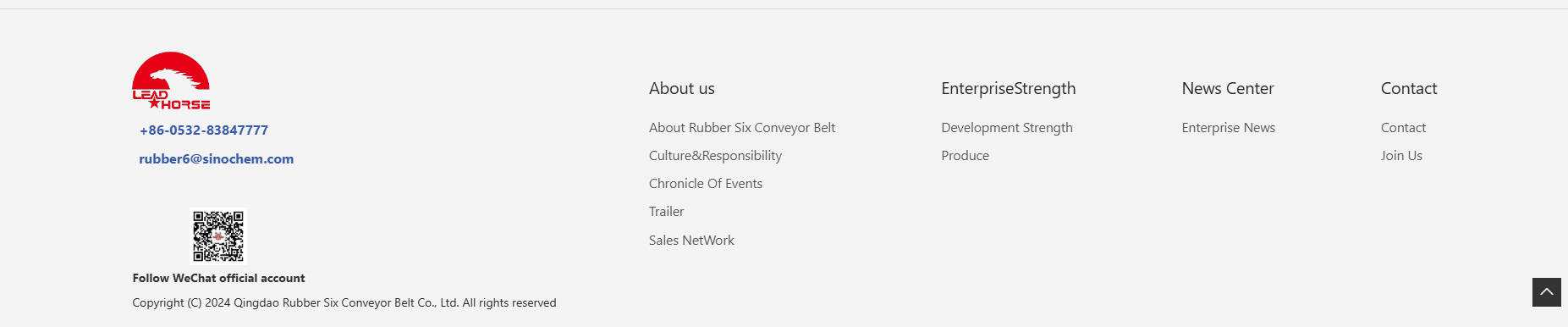 Qingdao Rubber Six takes "leading technology, customer first" as the foundation of its enterprise, providing customized products and services to customers. It is committed to researching and developing energy-saving, safe, and environmentally friendly high-end conveyor belt products. It is the first enterprise in China to develop tubular wire rope core conveyor belts, ultra wide (2250mm) fabric tubular conveyor belts, and MT668 standard steel wire conveyor belts.