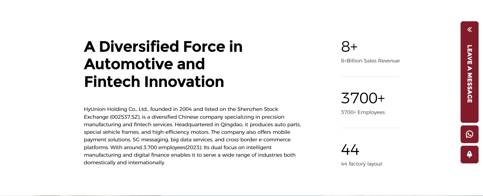 HyUnion Holding Co., Ltd. is a China-based industrial technology group listed on the Shenzhen Stock Exchange since 2011. Originally founded in 2004 as Qingdao Haili Meida, the company has evolved into a multi-business enterprise with a core focus on intelligent manufacturing, particularly in automotive lightweight components, while also maintaining business in mobile messaging services. Headquartered in Qingdao, the company has developed strong nationwide operations with over 40 manufacturing facilities.